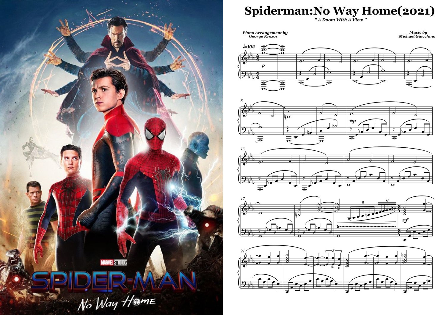 Piano sheet music for ''A Doom With A View'' from MARVEL STUDIOS Action / Fantasy film SPIDERMAN : NO WAY HOME (2021). Music by Michael Giacchino.