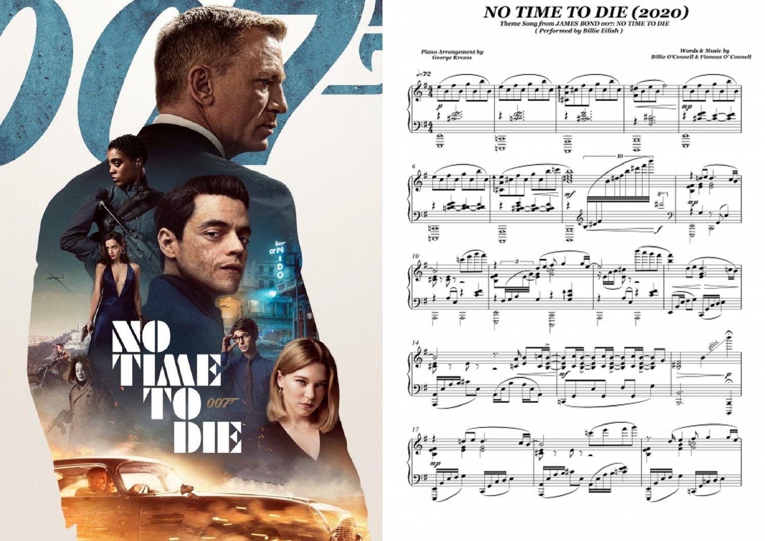 Piano sheet music for ''Theme Song'' from the James Bond movie NO TIME TO DIE (2020). Song writers : Billie O'Connell & Finneas O'Connell. Performed by Billie Eilish.