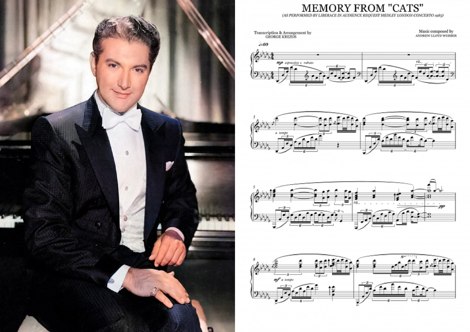 Piano sheet music for Memory from ''Cats'' as arranged & performed by Liberace. Music by Andrew Lloyd Webber .