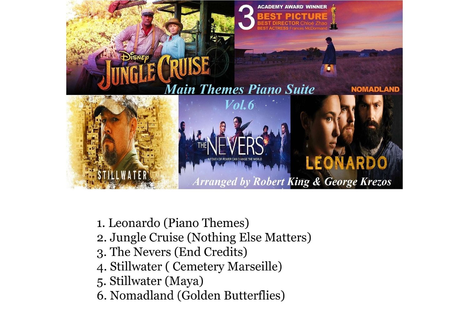 This Piano Suite contains 5 main themes from famous Movie / TV soundtracks composed by James Newton Howard / Metallica / Ludovico Einaudi / Mychael Danna / Mark Isham / John Paesano. Arranged by George Krezos & Robert King.