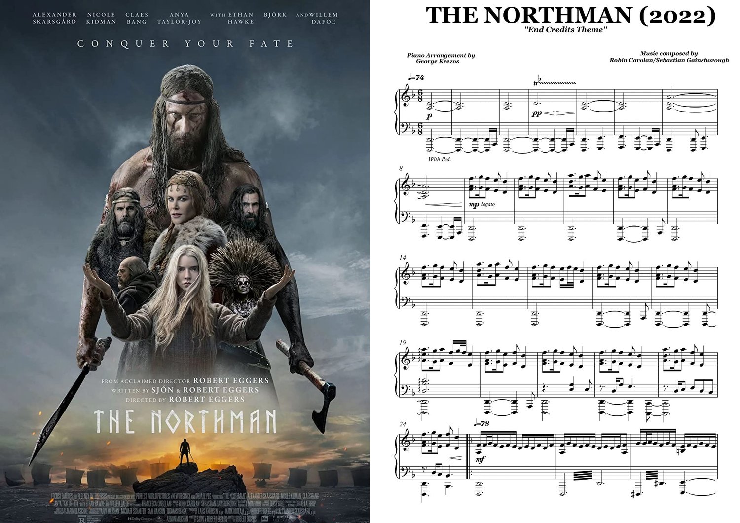 Piano sheet music for ''End Credits Theme'' from the Action / Adventure movie THE NORTHMAN (2022). Music by Robin Carolan & Sebastian Gainsborough.