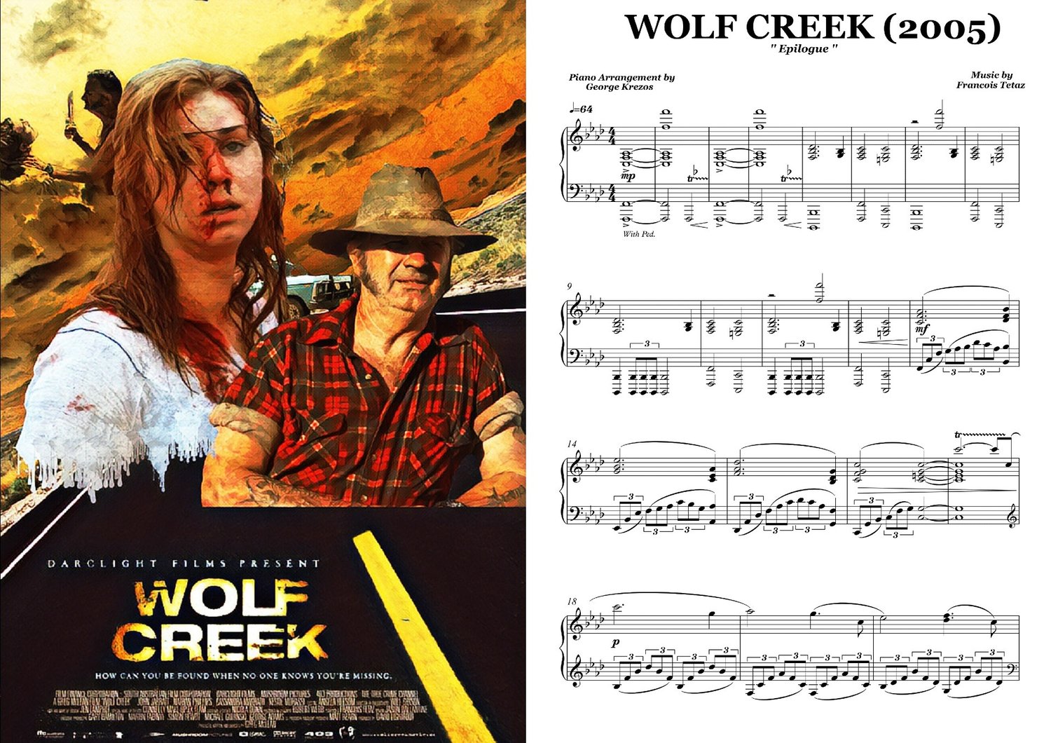 Piano sheet music for ''Pete & Trish'' from the Horror / Mystery Australian movie WOLF CREEK (2005). Music by Francois Tetaz.
