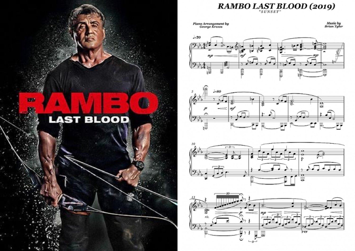 Piano sheet music for ''Sunset'' from the Action / Thriller Movie RAMBO : LAST BLOOD (2019). Music by Brian Tyler.