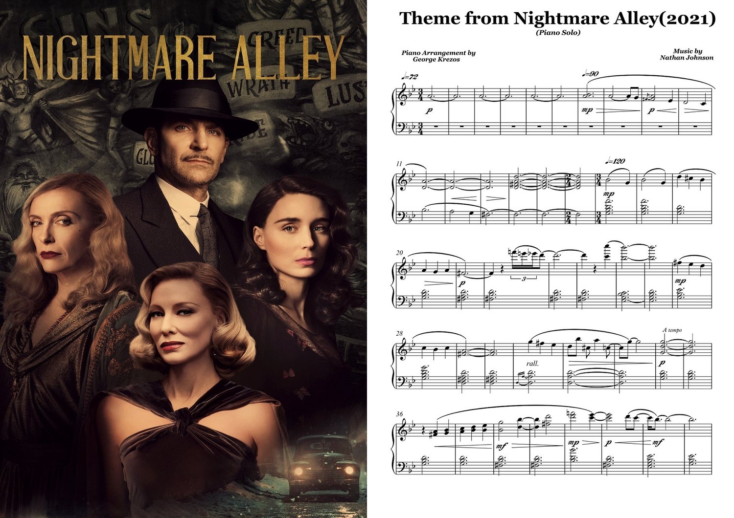 Piano sheet music for ''Theme from Nightmare Alley''(2021) directed by Guillermo del Toro starring Bradley Cooper, Kate Blanchett etc. Music composed by Nathan Johnson. Piano Arrangement by George Krezos.