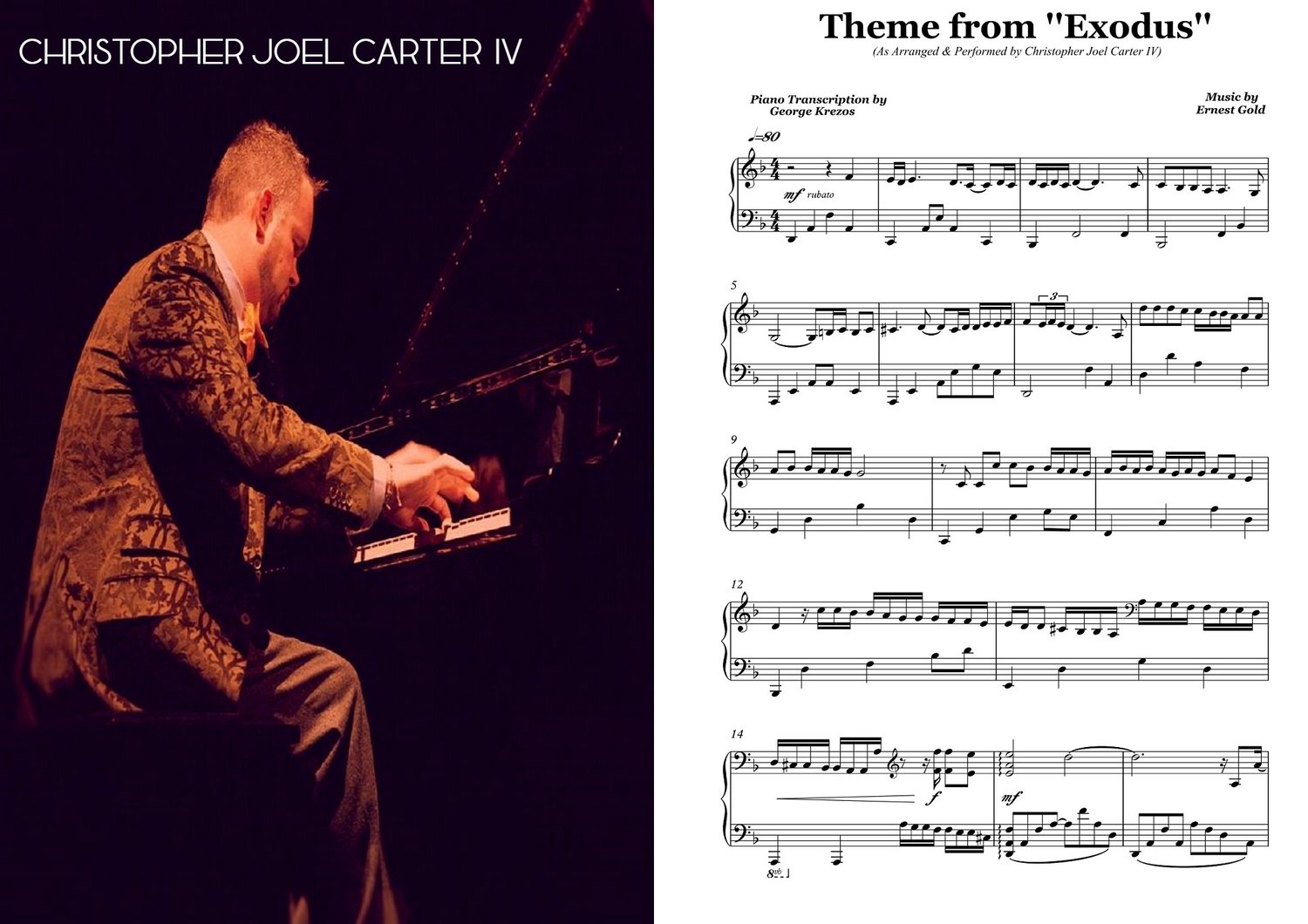 Piano sheet music for the very well known theme from the movie ''EXODUS''(1960) as arranged & performed by Christopher Joel Carter IV.