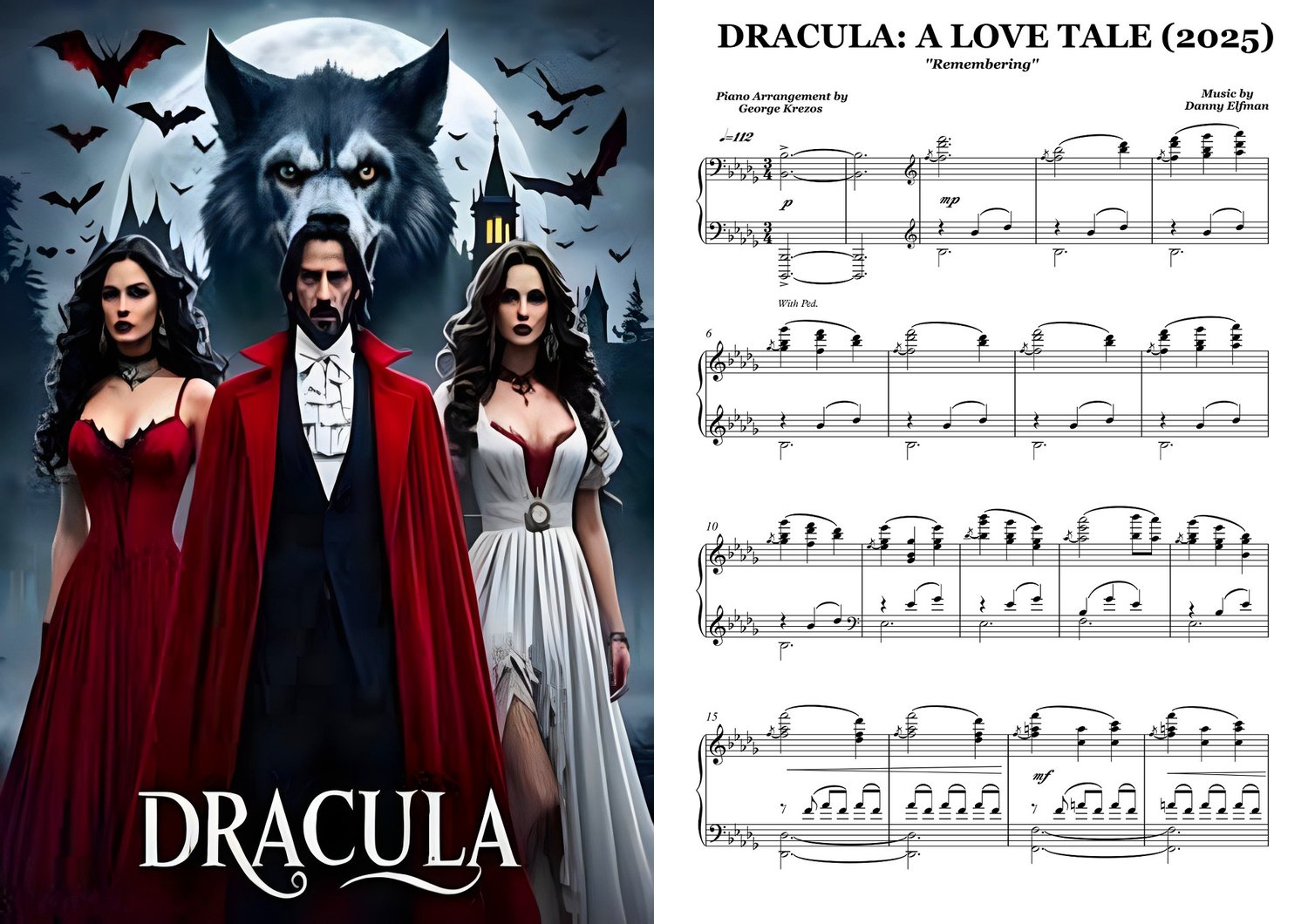 Piano Sheet music for ''Remembering'' (Love Theme) from Luc Besson's Horror/Romance film DRACULA: A LOVE TALE (2025). Music by Danny Elfman. Piano arrangement by George Krezos. The level of difficulty is intermediate. Complete 3 page PDF file available for download upon purchase.